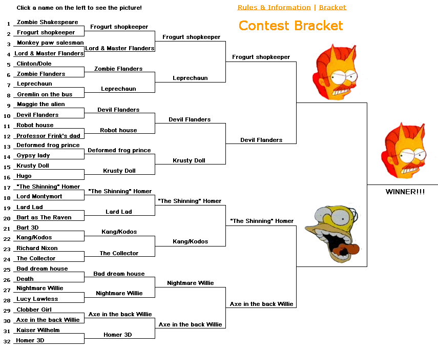 Homer 3D Kaiser Wilhelm Aex in the back Willie Clobber Girl Lucy Lawless Nightmare Willie Death Bad dream house The Collector Richard Nixon Kang & Kodos Bart 3D Bart as Lard Lad Lord Montymort Hugo, Bart's insane twin brother The Krusty doll Gypsy lady Deformed frog prince Professor Frink's dad Robot house Devil Flanders Maggie the alien Gremlin on the bus Leprechaun Zombie Flanders Clinton & Dole Lord & Master Flanders Monkey's paw slaesman Frogurt shopkeeper Zombie Shakespeare